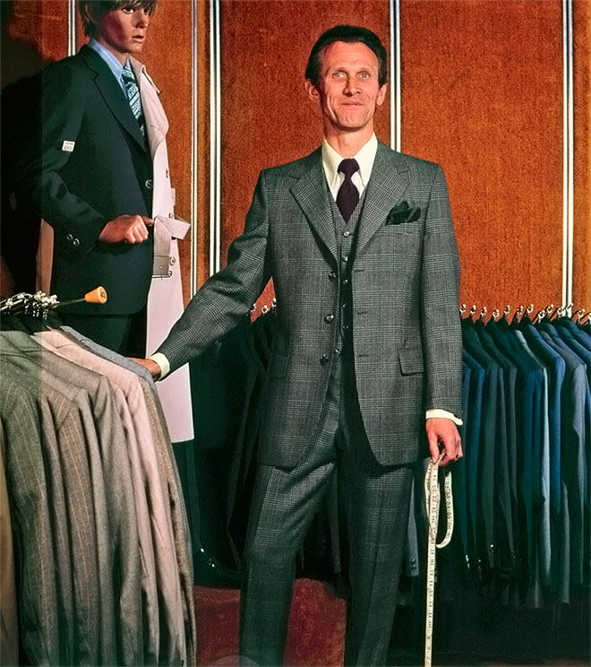 Цена костюма зависит от применения и количества ручной работы, от типа ткани (например, он может быть из обычной шерсти, гребенной шерсти или сирсакера), от качества ткани и от количества деталей. Есть ли на лацканах отделочная строчка? Расстегиваются ли пуговицы на рукавах или это обманки?