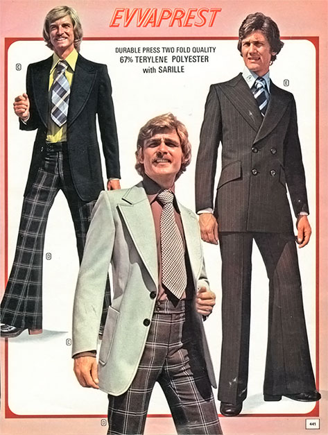 Кроме того, в 70-х, когда только начало развиваться производство синтетических тканей, большим успехом пользовались повседневные костюмы из чистого полиэстера. Сейчас редко когда встретишь одежду из стопроцентного полиэстера, потому что и на вид и на ощупь он кажется слишком ненатуральным.