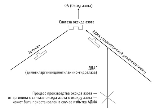 Однако, как вы можете увидеть из рис. 2, у синтазы оксида азота есть соперник — асимметричный диметиларгинин, или АДМА, который вырабатывается нашим организмом в процессе естественного белкового обмена. Когда в организме образуется слишком много АДМА, то L-аргинину уже нет места в реакции с синтазой оксида азота и производство окиси азота становится невозможным. Существует еще один чувствительный фермент с грозным названием — диметиларгининдиметиламино-гидралаза, или ДДАГ, — который разрушает АДМА, тем самым стимулируя производство оксида азота. Проблема в том, что стандартные факторы риска развития сердечно-сосудистых заболеваний (высокий уровень холестерина, высокий уровень триглицеридов, сопротивляемость инсулину, гипертония, курение) негативно отражаются на способности этого чувствительного фермента уничтожать молекулы АДМА.
