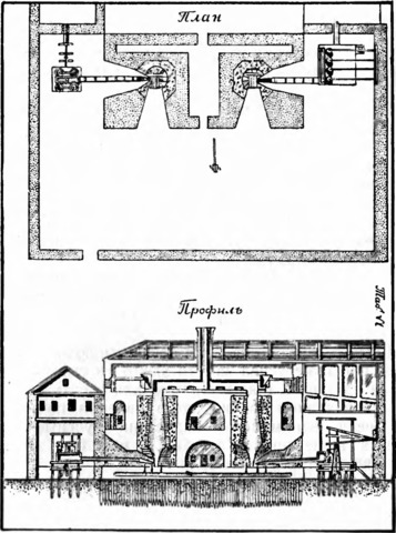 Разрез доменной фабрики. (С рисунка П. П. Аносова.)