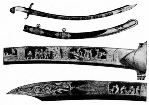 Клинок работы Бушуева (1837 г.) с фрагментами рисунков, отображающих процессы производства и украшения оружия. (Из фондов Государственного Эрмитажа в Ленинграде.)