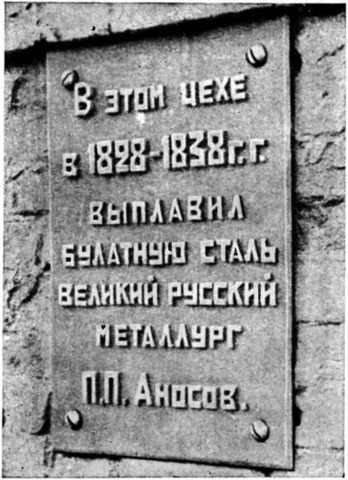 Мемориальная доска, установленная на одном из зданий бывшей оружейной фабрики, где работал П. П. Аносов.