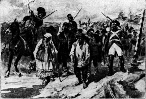 Пригон крепостных. (С картины художника К. А. Савицкого. Государственный исторический музей, Москва.)