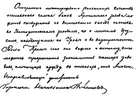 Последняя страница докладной записки П. П. Аносова об открытом им Артинском месторождении точильного камня (корунда).