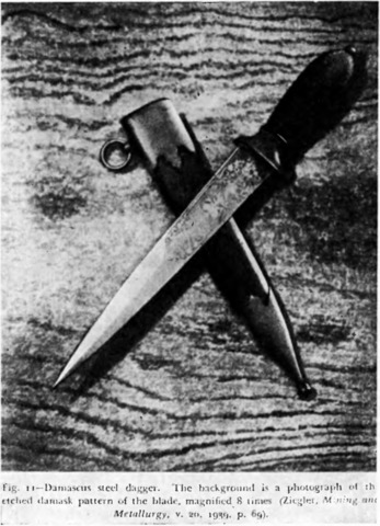 Репродукция из книги американского популяризатора Сиско «Современная металлургия». Из подписи под снимком следует, что этот клинок будто бы сделан из дамасской стали. Но посмотрите на следующий рисунок.