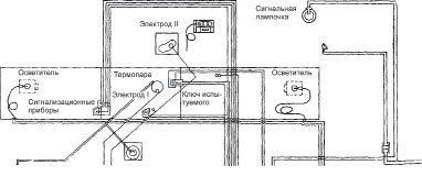 2. Приборы сигнализации : кнопка сигнала к испытуемому; сигнализационное устройство, связанное с главным ключом, для сообщения с ассистентом; выключатель сигнализации (для контрольных опытов); сигнальная лампочка от ключа испытуемого и сигнальная лампочка от ассистента.3. Приборы регистрации температуры кожи руки испытуемого: переходная колодка линии термопары; ключ, закорачивающий эту линию, реостат и декадный магазин сопротивления (на схеме не обозначен); зеркальный гальванометр (II).