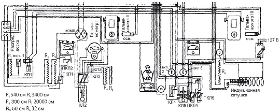 1. Приборы подачи раздражителей : а) рубильник включения тока городской сети, реостат и вольтметр переменного тока для контроля постоянства напряжения в цепи проекционных ламп, главный ключ – замыкатель цепи ламп и рубильник переключения с одной лампы на другую, параллельный главному ключу бесшумный ртутный размыкатель (на схеме не показан); б) индукционный аппарат Дюбуа-Реймона, выключатель и ключ подачи электрического раздражителя; в) выключатель лампы дополнительного освещения (зрительный раздражитель).