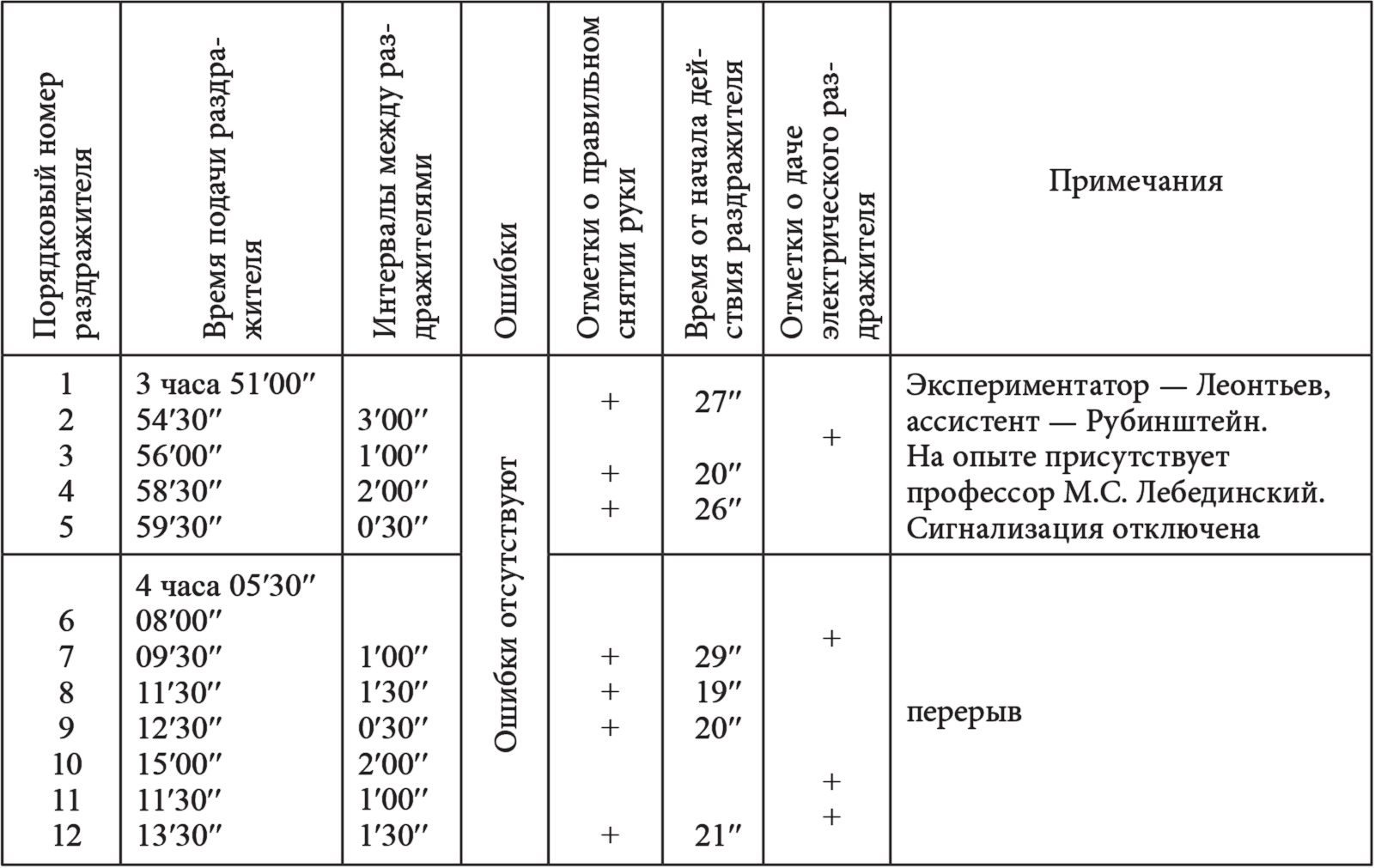 Как пример протекания опыта приведем протокол одного из последних экспериментов с этим испытуемым (табл. 1).