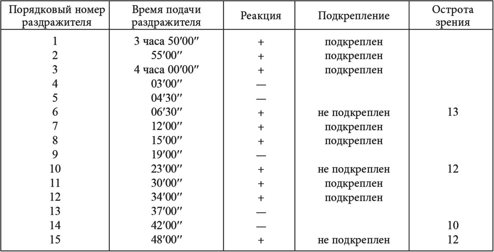 Как правило, мы впервые ставили контрольные (без подкрепления) опыты с испытуемыми лишь после того, как они впервые давали заметное превышение числа правильных реакций по отношению к ошибкам. Только у двух испытуемых, Кам. и Григ., у которых чувствительность кожи к действию видимых лучей вовсе не могла быть констатирована, опыты с условным сенсорным рефлексом все же в конце серии были проведены. Однако результаты, как и следовало ожидать, получились у них отрицательные: несмотря на весьма большое число сочетаний, сенсорный рефлекс у них не образовался.