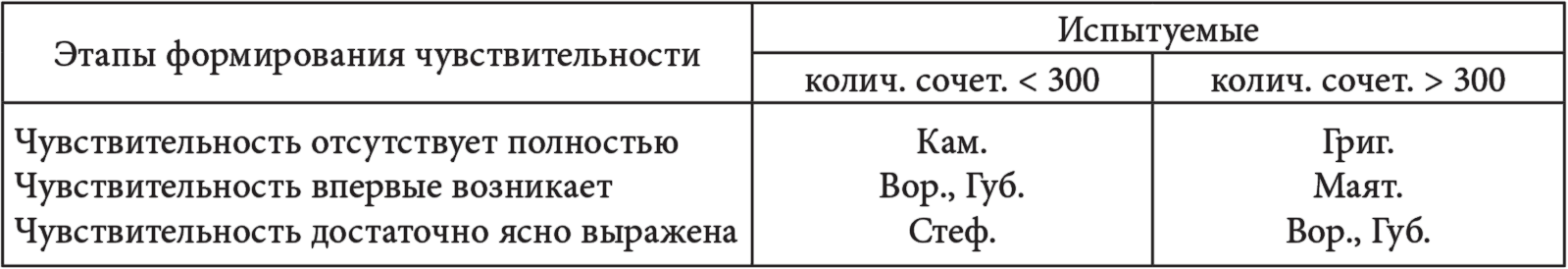 То, что двое из испытуемых (Вор. и Губ.) оказались одновременно в двух группах, объясняется тем, что данные, полученные у этих испытуемых, составляют как бы две фазы: фазу первого появления правильных реакций и фазу ясно выраженной чувствительности, что совпадает с различным количеством проведенных с ними опытов.Таблица 5