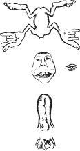 Очень ярко видно, как отражаются в строении коры мозга новые, специфически человеческие черты при исследовании так называемого проекционного двигательного поля (на рис. 18 оно обозначено цифрой 4). Если осторожно раздражать электрическим током различные точки этого поля, то по вызываемому раздражением сокращению различных мышечных групп можно точно представить себе, какое место занимает в нем проекция того или иного органа. Пенфильд выразил итог этих опытов в виде схематического и, конечно, условного рисунка, который мы здесь приводим (рис. 19). Из этого рисунка, выполненного в определенном масштабе, видно, какую относительно большую поверхность занимает в человеческом мозге проекция таких органов движения, как рука (кисть) и особенно органы звуковой речи (мышцы рта, языка, органы гортани), функции которых развивались особенно интенсивно в условиях человеческого общества (труд, речевое общение).Совершенствовались под влиянием труда и в связи с развитием мозга также и органы чувств человека. Как и органы внешней деятельности, они приобрели качественно новые особенности. Уточнилось чувство осязания; очеловечившийся глаз стал замечать в вещах больше, чем глаза самой дальнозоркой птицы; развился слух, способный воспринимать тончайшие различия и сходства звуков человеческой членораздельной речи.