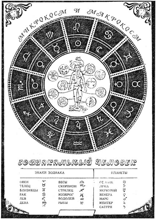 Астрологический человек-микрокосм изображался в круге — символе вечности, в окружении макрокосма — планет и знаков Зодиака (рис. 1). Вне связи с западной традицией концепция микрокосма развивалась на Востоке (например, в Китае — «Книга перемен»), где она пользуется популярностью и в наше время (на основе энергетической концепции » инь — ян»).