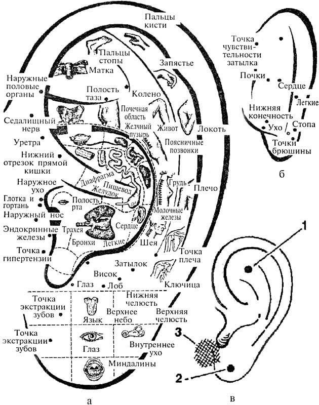 а — передняя; б — задняя поверхности ушной раковины; в — ушная раковина с точками, ответственными за наш «покой» и состояние нервной системы: точка 1 — «божественные ворота», или «антистрессовая»; точка 2 — «универсальный регулятор» (она поможет вам и вашему ребенку уснуть, а при сонливости придаст бодрость); точка 3 — для борьбы с меланхолией и связанными с ней тяжелыми воспоминаниями и мрачными мыслями