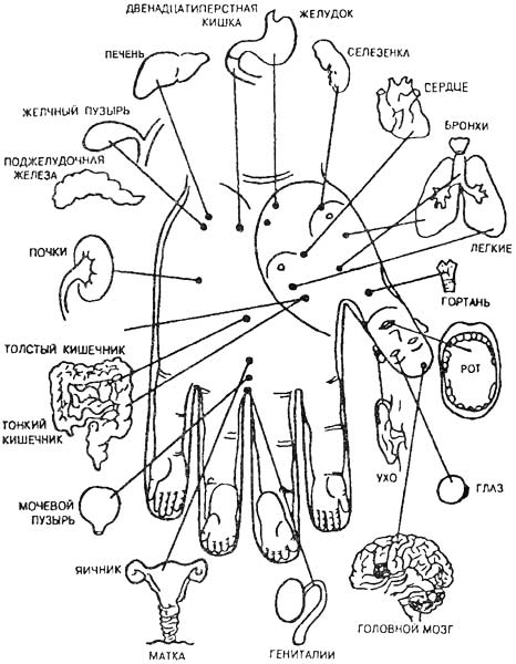 Теперь перейдем к другим участкам тела, где тоже имеется представительство всего организма. Это зоны кистей рук (рис. 6). Однако рисунок не отражает всего многообразия существующих рефлекторных связей рук с различными органами и системами человека. Так, например, верхние фаланги пальцев (со II по V) — это тоже проекция головы (по аналогии с первыми пальцами, но там, если так можно выразиться, самая главная проекция головы). В то же время вторые фаланги II-V пальцев — это проекция грудной клетки с входящими в нее легкими и сердцем, а вот третьи фаланги — проекция нижней половины тела и т. д. Отсюда вам должно быть понятно, что, даже массируя одни только пальцы (не говоря уже о ладонях), вы воздействуете на весь организм. Разумеется, эффективность процедуры еще больше повышается, если вы со всех сторон тщательно растираете не только пальцы, но и тыл, а также ладонные поверхности кистей. Если будет возможность, то совсем неплохо для этой цели воспользоваться массажными кольцами для пальцев рук, хотя пока приобрести их можно только в киосках при клиниках су-джок, которых даже в Москве пока немного.