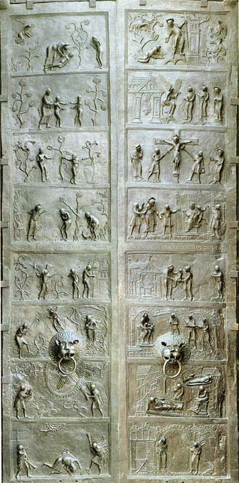 Связь между Ветхим и Новым Заветами присутствует в каждом сюжете, представленном на бронзовых дверях. Изображения грехопадения (то есть момента, когда Адам и Ева вкусили от яблока познания), а также Распятия Иисуса Христа расположены на одном уровне. Это означает, что Иисус умер на Кресте, дабы освободить людей от грехов, которые они начали совершать со дня своего грехопадения.