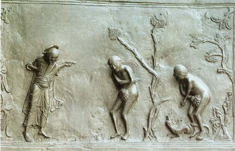 Ниже, на рельефе под изображением грехопадения, Бог Отец призывает Адама и Еву к ответу за их прегрешение (рис. 106). Человеческие фигурки выделяются над бронзовой поверхностью дверей гораздо четче и резче, чем изображение растений. Слева стоит Бог Отец, справа находятся Адам и Ева. У ног Евы извивается змея. Присмотревшись к позам и жестам фигурок, можно заметить, что вину за случившееся Адам возлагает на Еву.