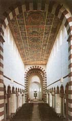 Бронзовые двери вели прежде в церковь святого Михаила в Гильдесгейме, которая была построена в 1010–1033 гг. Заказ на строительство церкви дал епископ Бернвард. Ему хотелось, чтобы церковь, в которой он будет похоронен, была богато украшена. Поэтому в 1015 г. епископ повелел сделать эскиз больших бронзовых дверей, а затем отлить их в бронзе. Если открыть бронзовые двери с рельефными изображениями в нашем музее, то мы окажемся в помещении, которое выглядит точно так же, как церковь святого Михаила (рис. 107, 108). Средний неф отделяется от боковых попеременно двумя колоннами и одним пилоном. На колонны и пилоны опираются полукруглые арки. Над ними гладкая стена, без изображений. Внутреннее пространство церкви освещается через окна, расположенные вверху под самой крышей, которые выполнены в виде полуциркульных арок. Итак, мы находимся в базилике. Как все раннехристианские базилики, церковь святого Михаила имеет деревянное перекрытие. Роспись церкви датируется более поздним временем.