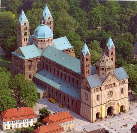 Кафедральный собор в Реймсе (140 метров в длину и 38 метров в высоту) немного больше собора в Шпайере. Однако благодаря стрельчатым сводам и большим окнам внутреннее помещение кафедрального собора кажется более высоким и более легким. В Шпайере пролеты боковых нефов в половину короче пролетов центрального нефа. Гурты боковых нефов опираются на пилоны, которые располагаются в центральном нефе между отдельными пролетами. В Реймсе же, напротив, пролеты боковых нефов имеют ту же длину, что и пролеты центрального нефа. В данном случае отпадает необходимость в промежуточных пилонах. Благодаря подобному решению свет из окон боковых нефов освещает также пространство центрального нефа.