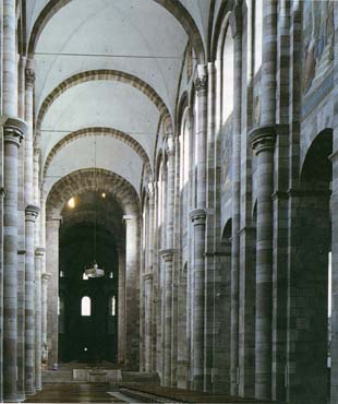 Хотя церковь святого Михаила и собор в Шпайере относятся к одному времени, внутреннее помещение в Шпайере выглядит совсем не так, как в Гильдесгейме (рис. 107). Средний неф в Шпайере отделен от боковых нефов массивными пилонами. Вверху пилоны, которые здесь намного выше, чем в церкви святого Михаила, увенчаны полукруглыми арками. А вот площадь стен меньше за счет увеличения размеров окон. В церкви святого Михаила стены совсем плоские. В Шпайере по всей высоте пилоны опираются на четырехугольные опоры и таким образом как бы членят стену на отдельные отрезки. Каждая вторая из этих опор, которые называются пристенными пилонами, поддерживает одну из арок, несущих свод. Такая арка называется гуртом (от нем. Gurt — пояс, подпруга). С их помощью укрепляют ребра крестового свода. Наиболее тонкие пристенные пилоны усиливают арки окон. Это необходимо, поскольку свод нагружает стены.