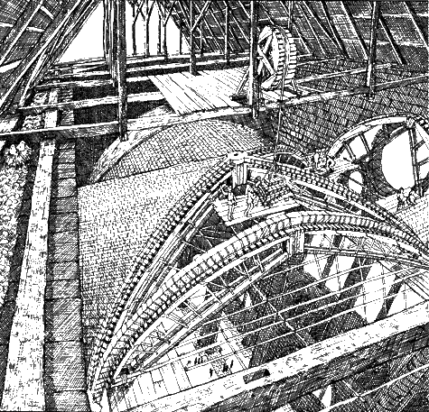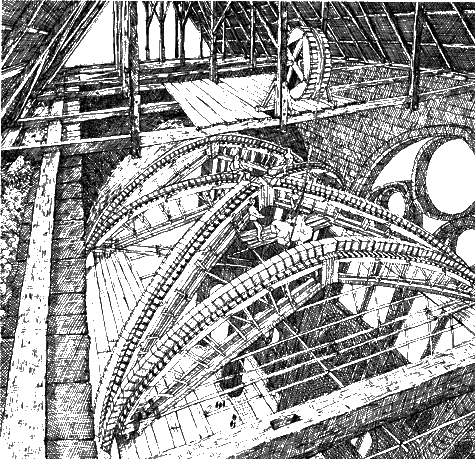 Пока не было готово оборудование строительного цеха, все работы в церкви на зимний период приходилось приостанавливать. И только в цеху, который можно себе представить как очень большой отапливаемый дом, работали в холодное зимнее время. Каменотесы, например, могли там изготавливать отдельные каменные блоки для пилонов (рис. 119). Летом их устанавливали на место. Благодаря зимним подготовительным работам летом строительство шло намного быстрее, появилась возможность возводить большие кафедральные соборы. Возводили их примерно за 20 лет — при условии, разумеется, что в этот период не было войн, голода, эпидемий. Иногда из-за недостатка денег или изменения планов работы могли замирать на годы. Работа на крупных строительствах редко проходила без длительных перерывов. Например, строительство Кельнского собора было начато в 1248 г., а завершилось лишь в 1880 г.