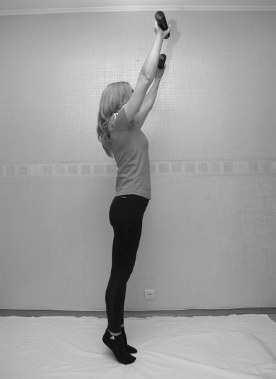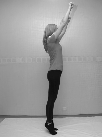 Быстро приподнимитесь на цыпочках, и одновременно сделайте мах руками вперед и вверх — то есть поднимите руки над головой.