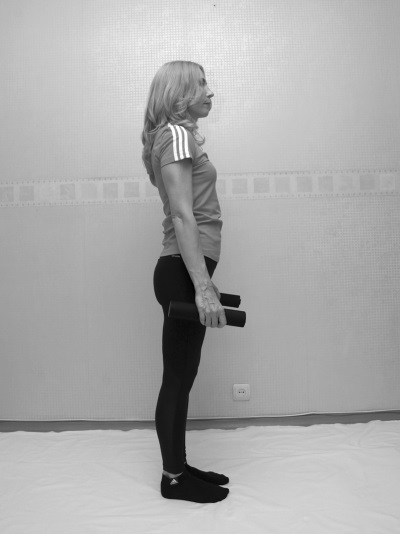 ИСХОДНОЕ ПОЛОЖЕНИЕ: стоя. Руки согнуты в локтях, гантели около плеч.