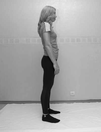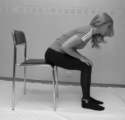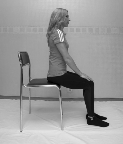 ИСХОДНОЕ ПОЛОЖЕНИЕ: сидя на краю стула. Ноги согнуты под углом чуть больше, чем 90°. Руки лежат на коленях.