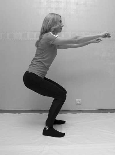 Не отрывая стопы от пола и не смещая их, плавно и без рывков потянитесь грудью вперед, в направлении коленей, словно пытаетесь сесть.