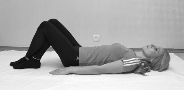 ИСХОДНОЕ ПОЛОЖЕНИЕ: лежа на спине. Ноги согнуты в коленях, голень левой ноги расположена крест-накрест поверх голени правой ноги. Стопы на полу. Руки вытянуты вдоль тела.