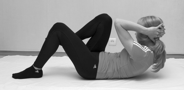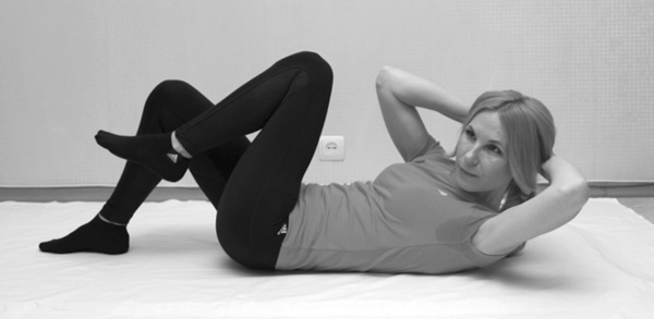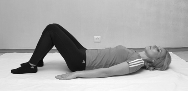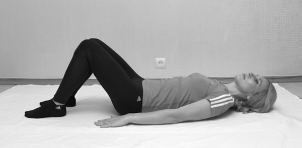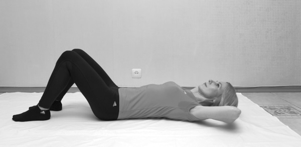 ИСХОДНОЕ ПОЛОЖЕНИЕ ТАКОЕ ЖЕ, КАК В ПРЕДЫДУЩЕМ УПРАЖНЕНИИ: лежа на спине, ноги согнуты в коленях, стопы плотно прижаты к полу, руки вытянуты вдоль тела.