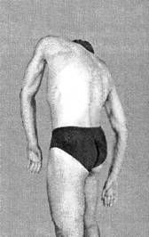 Лечебное движение при ограничении подвижности ребер в верхнегрудном отделе позвоночника осуществляют в положении стоя, туловище и голова в положении сгибания и вращения в сторону, противоположную больной стороне, так, чтобы ребра в месте болезненных ощущений создавали выпячивание. Одна рука свободно свисает в сторону сгибания и вращения туловища, плечо расслаблено, другая рука свободно свисает с другой стороны туловища. На фазе «вдох» в течение 9-11 секунд максимально поднять ребра в месте болезненных ощущений. На фазе «выдох» в течение 6-8 секунд расслабление мышц и опускание ребер. Лечебное движение повторить 3-6 раз (рис. 46).