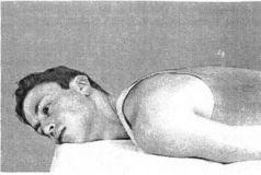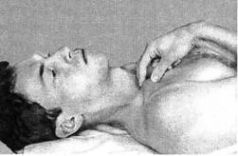 Лечебное движение при болях в сочленении грудины с ключицей проводить в положении лежа на спине. Большим пальцем снизу и указательным пальцем сверху захватить ключицу в непосредственной близости от сустава грудины и смещать ее вверх и вниз к голове и ногам ритмичными движениями в медленном темпе (рис. 47).