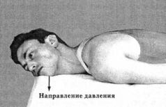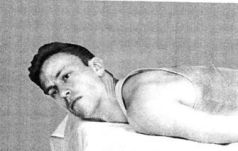 Лечебное движение при болях, усиливающихся при поворотах в нижнешейном отделе позвоночника, проводят в положении лежа на животе, руки вдоль туловища, подбородок упирается в головной край кушетки, голова с максимально возможным поворотом в сторону боли. На фазе «вдох» в течение 9-11 секунд давить подбородком на кушетку.