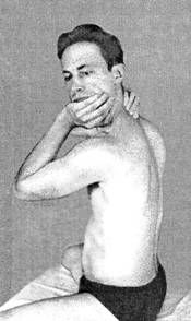 Лечебное движение при болях, усиливающихся при поворотах в нижнешейном отделе позвоночника, проводят в положении сидя. Тылом ладони одной руки, поднятой на уровень подбородка, удерживать голову в положении максимально возможного поворота в сторону боли. Пальцами другой поднятой руки фиксировать выпирающий нижележащий поперечный отросток.