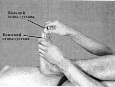 Лечебное движение при болях в пальцах ноги осуществлять в положении лежа или сидя. Нога, на которой проводят вытяжения пальцев стопы, максимально согнута в тазобедренном и коленном суставах. Фиксировать большим и указательным пальцами кисти одной руки ближний, а большим и указательным пальцами кисти другой руки дальний отдел сустава пальца. На фазе «вдох» в течение 9-11 секунд проводить рукой вытяжение больного пальца против его сопротивления (оттягивать больной палец, держа его рукой, мышцы основания больного пальца должны сопротивляться вытяжению). На фазе «выдох» в течение 6-8 секунд расслабление мышц, за это короткое время нужно попытаться еще больше оттянуть больной палец (при этом мышцы пальца не сопротивляются вытяжению).