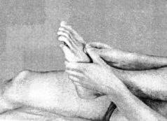 Лечебное движение при болях при разгибании стопы и пальцев ноги осуществлять в положении сидя поперек кушетки. Перекинуть больную ногу через колено здоровой ноги, фиксировать сверху большими, а снизу указательными пальцами рук передние отделы стопы и проводить разгибание стопы и пальцев ноги вверх против сопротивления больших пальцев рук. На фазе «вдох» в течение 9-11 секунд давить стопой вверх с минимальной силой против сопротивления больших пальцев рук. На фазе «выдох» в течение 6-8 секунд расслабление мышц, постараться увеличить амплитуду разгибания стопы и пальцев ноги вверх, помогая рукой (при этом мышцы не напрягать). Лечебное движение повторить еще 2-5 раз, с максимальной силой давя стопой против сопротивления больших пальцев рук. Каждый раз на фазе «выдох» чуть больше разгибать стопу и пальцы ноги без напряжения их мышц (рис. 91).