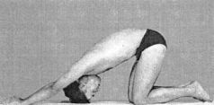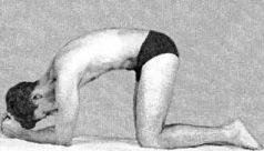 Лечебное движение при болезнях легких выполнять в положении стоя на коленях на кушетке, руки согнуты в локтях, бедра составляют прямой угол по отношению к туловищу. На фазе «вдох» в течение 9-11 секунд пытаться прогибать свою спину вверх, голова уходит вниз. В этом положении у вас будет максимально прогибаться среднегрудной отдел позвоночника. На фазе «выдох» в течение 6-8 секунд расслабление мышц, в это время естественным свободным движением попытаться чуть увеличить угол прогибания спины в двигательных сегментах среднегрудного отдела позвоночника (при этом мышцы не напрягать) Лечебное движение повторить 3-6 раз (рис. 124)