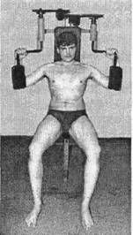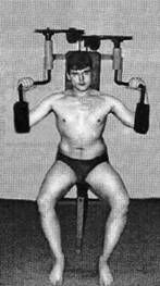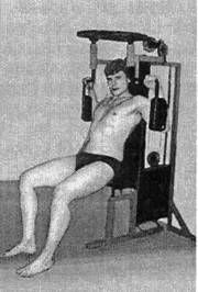 Упражнение для укрепления приводящих мышц плеча выполняют на специальном тренажере. В темпе 1 раз в 3-6 секунд приводить свои плечи к средней линии. Упражнение повторить 24-60 раз (рис. 128, 129, 130).