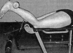 Упражнение при болях в коленных и тазобедренных суставах проводят на специальном тренажере. Предварительно согнув ноги до определенного положения, показанного на рисунке, на фазе вдоха медленно выпрямить их в коленных суставах, удерживая положение пружины тренажера в течение 9-11 секунд. Затем 6-8 секунд выдох. На следующем медленном вдохе в течение 9-11 секунд пытаться выпрямленные ноги поднять максимально вверх. Упражнение повторить 6-15 раз (рис. 133).