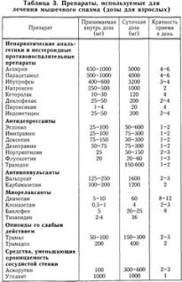 Медикаментозное лечение необходимо назначать по рекомендации врача всем больным с заболеваниями позвоночника, чтобы снять или уменьшить боль. Группы лекарственных средств подбирают таким образом, чтобы одно лекарство воздействовало на одно из звеньев, вызвавших развитие заболевания. В таблице 3 представлены препараты, используемые для лечения мышечного спазма (дозы для взрослых).