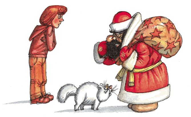 – Дед Мороз! Я подарки вам принёс! – проговорил старик, прикрывая узорчатой варежкой чёрную бороду.
