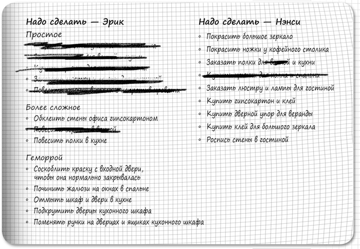 На двери в кухню они повесили два списка дел, по списку на каждого, и часто проверяли по ним друг друга — чтобы никто не смухлевал.