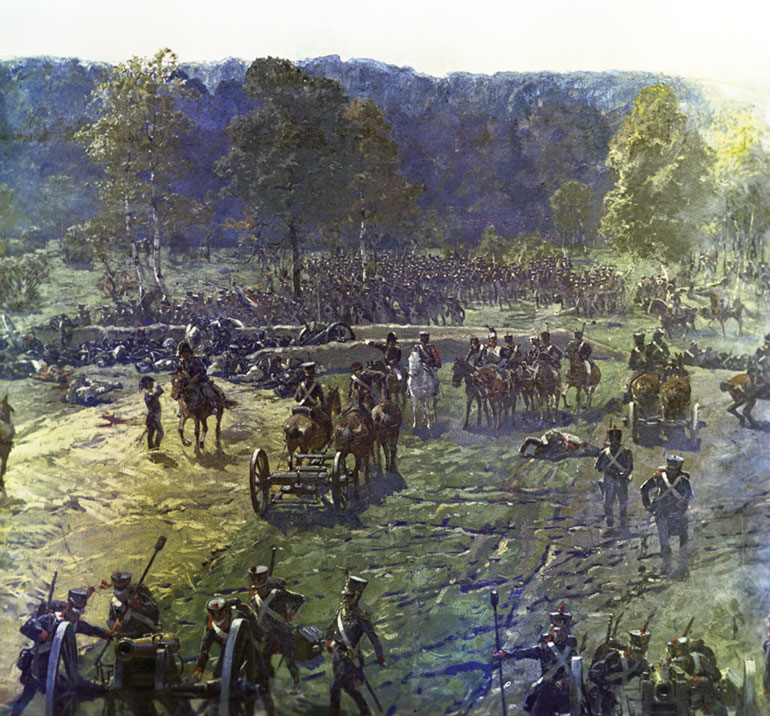 Репродукция фрагмента панорамы Бородинской битвы «Русские кирасиры устремились в атаку» худ. Ф. А. Рубо. Холст, масло. 1910–1912 гг. Из Музея-панорамы «Бородинская битва»