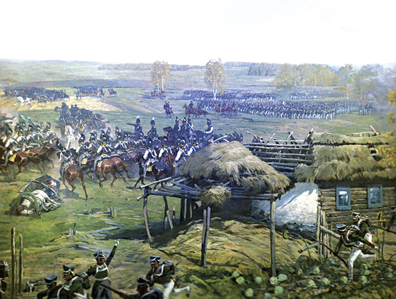 Тем временем войска Эжена де Богарне, воспользовавшись потрясающей атакой Коленкура, сковавшей действия 24-й дивизии генерала П. Г. Лихачева, ворвались на батарею с фронта и фланга».