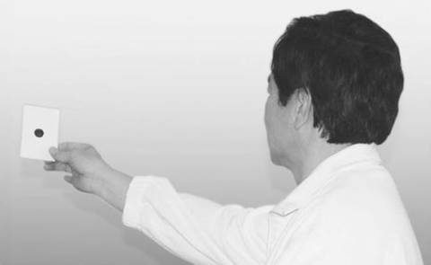 1. Держа голову ровно, переместите лист с черной точкой к вашему правому плечу и смотрите на точку в течение тридцати секунд.