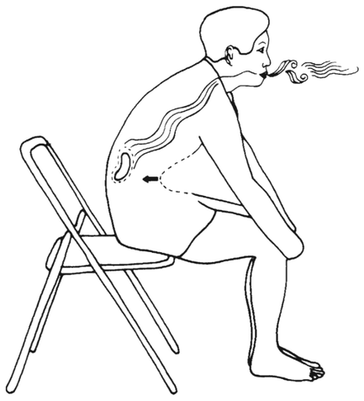 3. На выдохе округлите губы и тихо произнесите звук, производимый при задувании свечи (рис. 5.14). Одновременно втягивайте центр живота, находящийся между грудиной и пупком. Вообразите, что вы выдавливаете из окутывающего ваши почки пузыря, словно из тюбика, избыточное тепло, тяжелую, нездоровую энергию и страх (см. рис. 5.15).