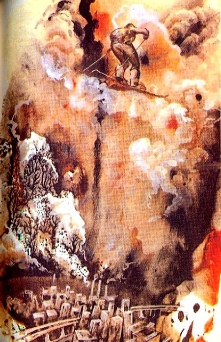Крисмас обернулся и увидел, что девушки на зеленом ящере уже нет, а сам ящер остановился и тянет длинную шею вниз, к сидящей в пыли фигуре. Девушка — это была она — воздела руки над головой, и в них поблескивало что-то металлическое. Крисмас прыгнул на санках через перила и, еще вываливаясь из них, схватил и сжал одной рукой сразу оба ее запястья.