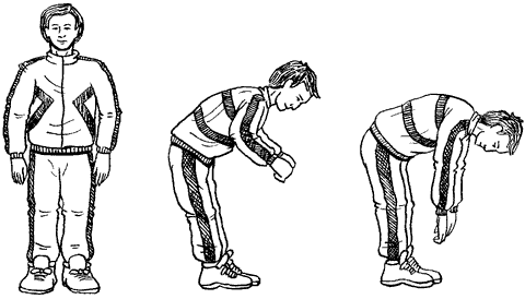 3. «Насос». И. п. то же. Ноги поставить чуть шире плеч, руки опустить вдоль туловища. Сделать легкий наклон вперед, пытаясь достать руками до пола (но не касаться его), и одновременно произвести вдох, который заканчивается вместе с наклоном вперед. Затем слегка приподняться и снова сделать короткий наклон вперед во время вдоха. Наклоны осуществляются ритмично и легко. Упражнение делается 12 раз по 8 вдохов-движений.