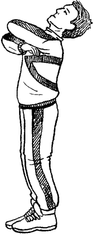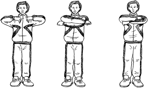 5. «Обними плечи». И. п. то же. Согнутые в локтях руки поднять до уровня плеч. Одновременно с вдохом выполняются движения руками, как бы обнимая плечи. Руки в момент «объятия» расположены параллельно друг другу. При выполнении движений руки не меняются (при этом все равно, какая рука будет сверху), широко не раздвигаются и не напрягаются. Во время встречного движения рук можно слегка откидывать голову назад. Упражнение выполняется 12 раз по 8 вдохов-движений.
