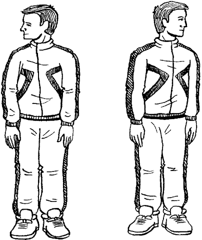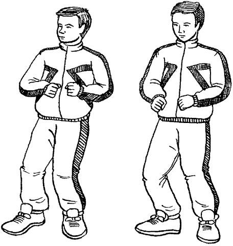 10. «Перекаты». И. п. то же. Левую ногу поставить вперед. Правая, слегка согнутая в колене, находится сзади и опирается на носок. Вес тела перенести на левую ногу. Сначала следует сделать танцевальное приседание на левой ноге, затем перенести тяжесть тела на правую ногу и тоже присесть. При этом во время приседания делаются «шмыгающие» вдохи носом. Упражнение выполняется 12 раз по 8 вдохов-движений. Это же упражнение делается с переменой ног, то есть вперед выставляется правая нога.